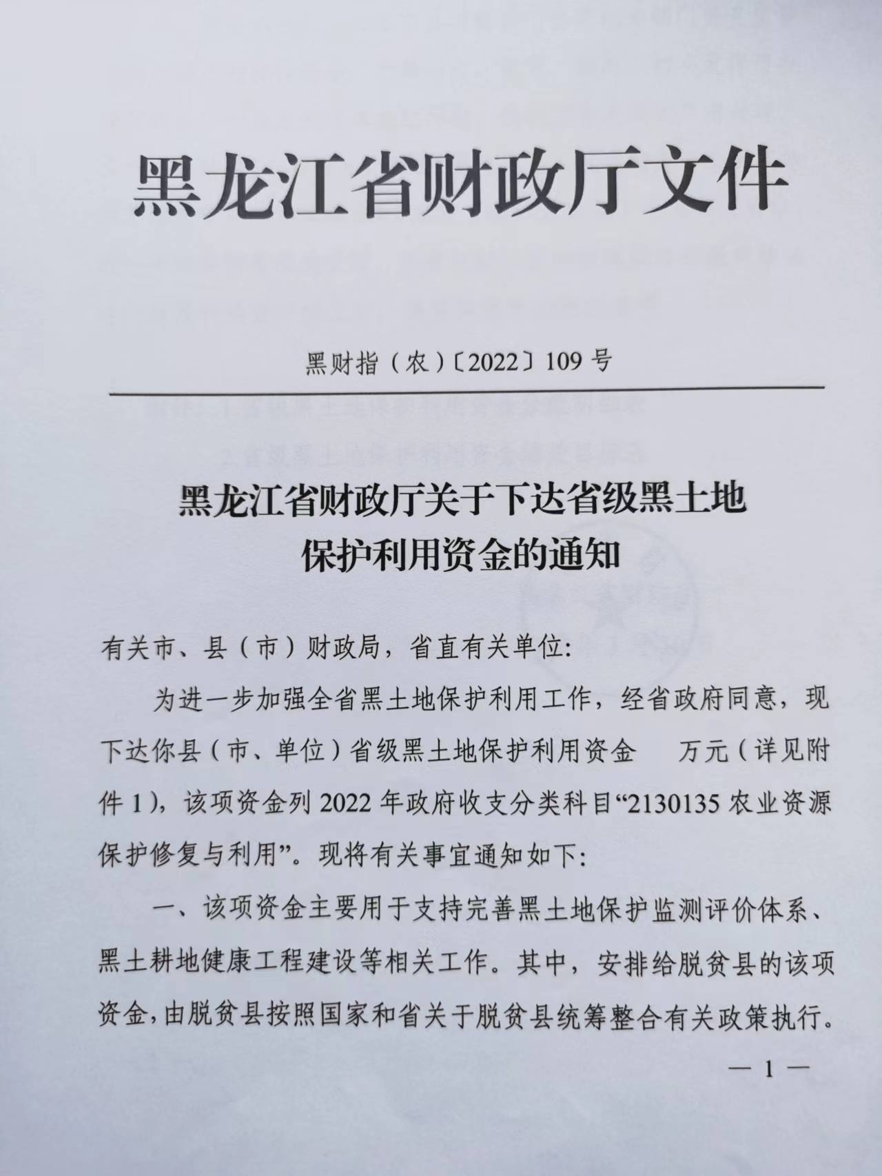 黑财指(农)【2022】109号 黑龙江省财政厅关于下达省级黑土地保护利用资金的通知