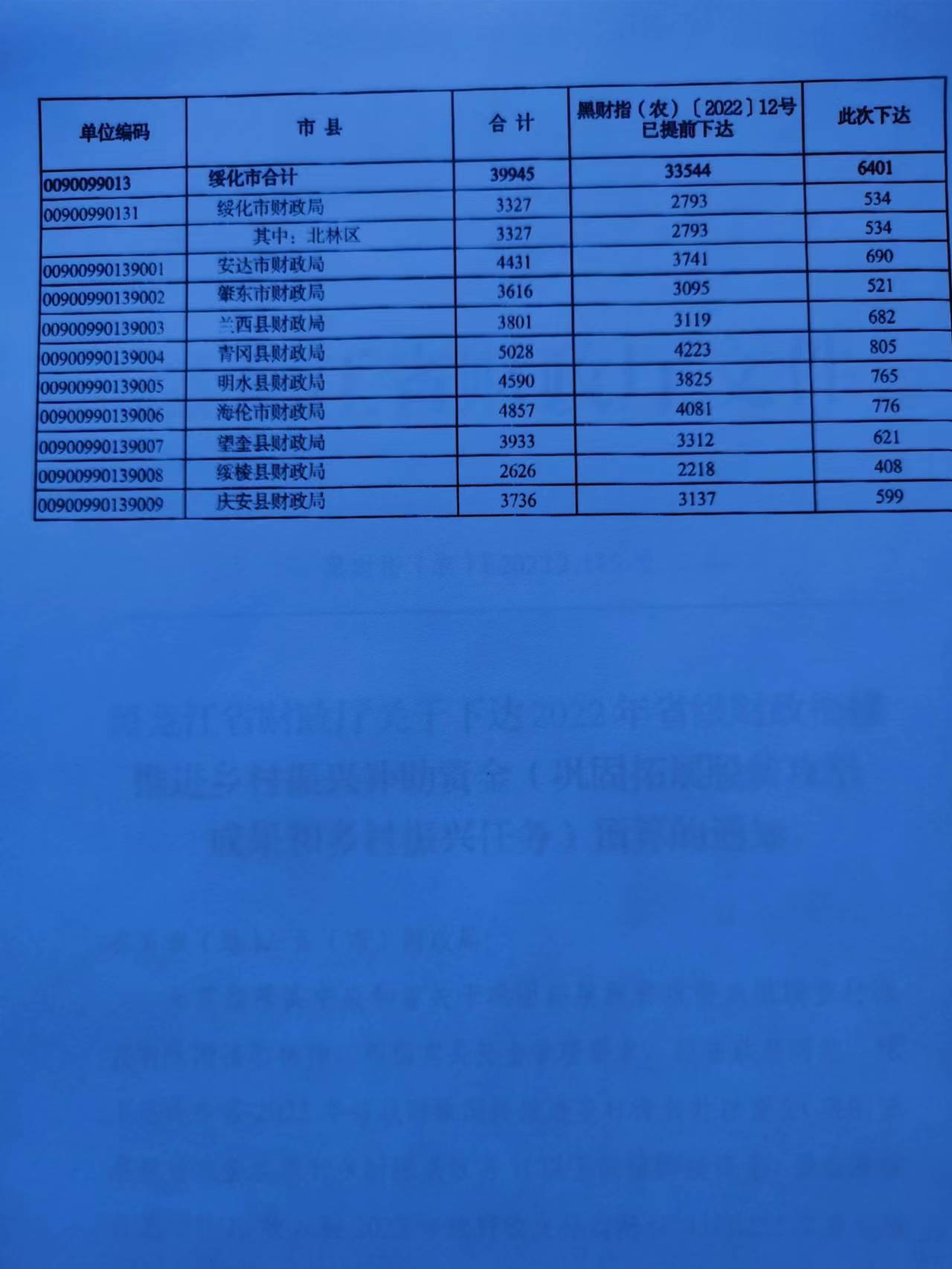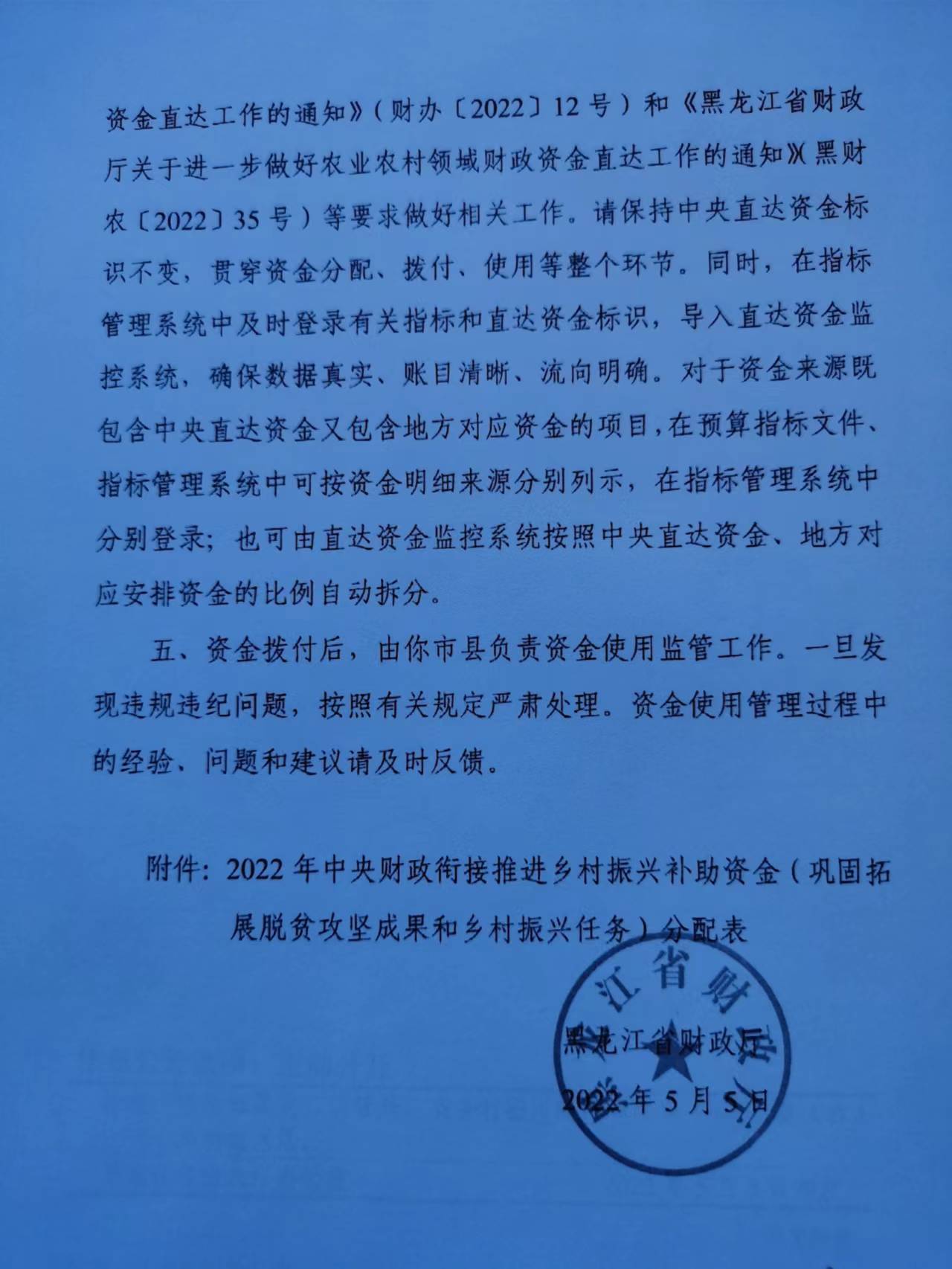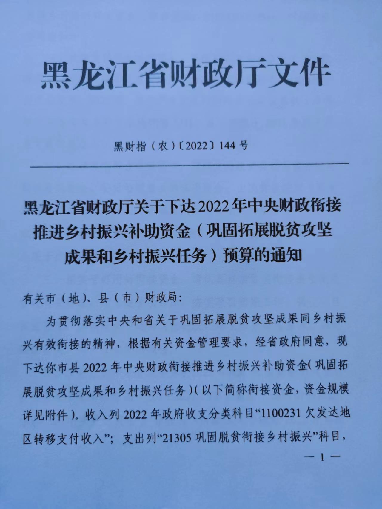 (黑财指农【2022】144号)黑龙江省财政厅关于下达2022年中央财政衔接推进乡村振兴补助资金(巩固拓展脱贫攻坚成果和乡村振兴任务)预算的通知