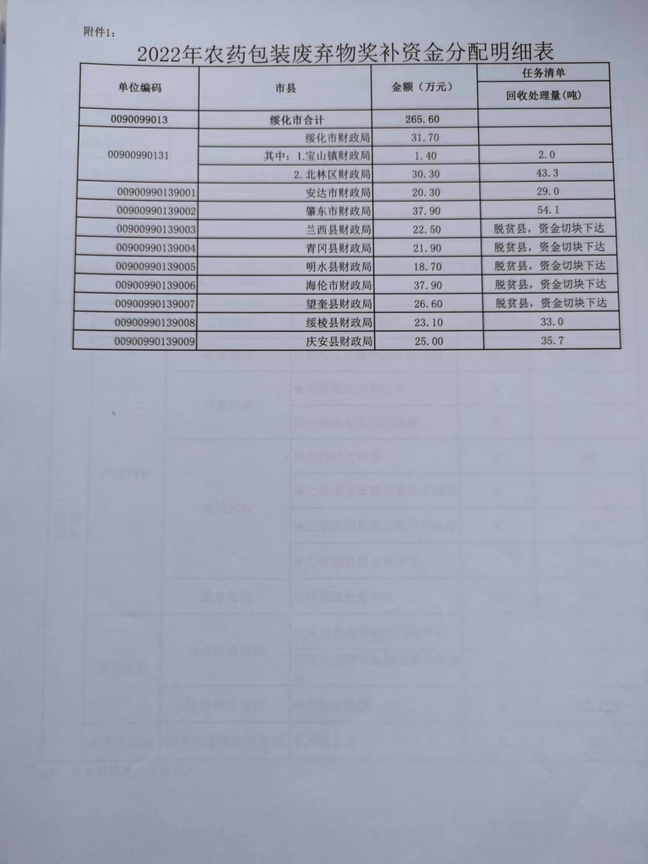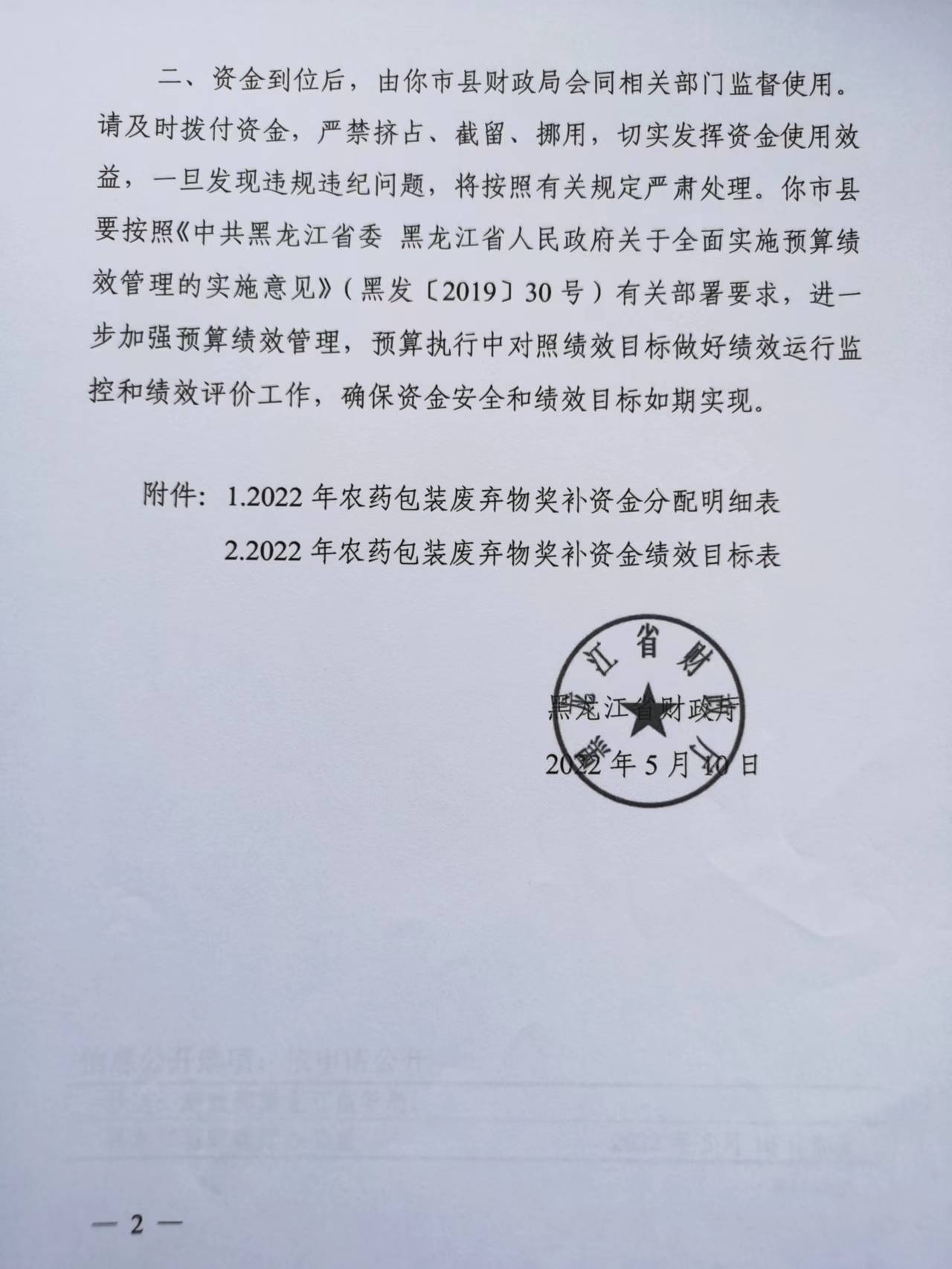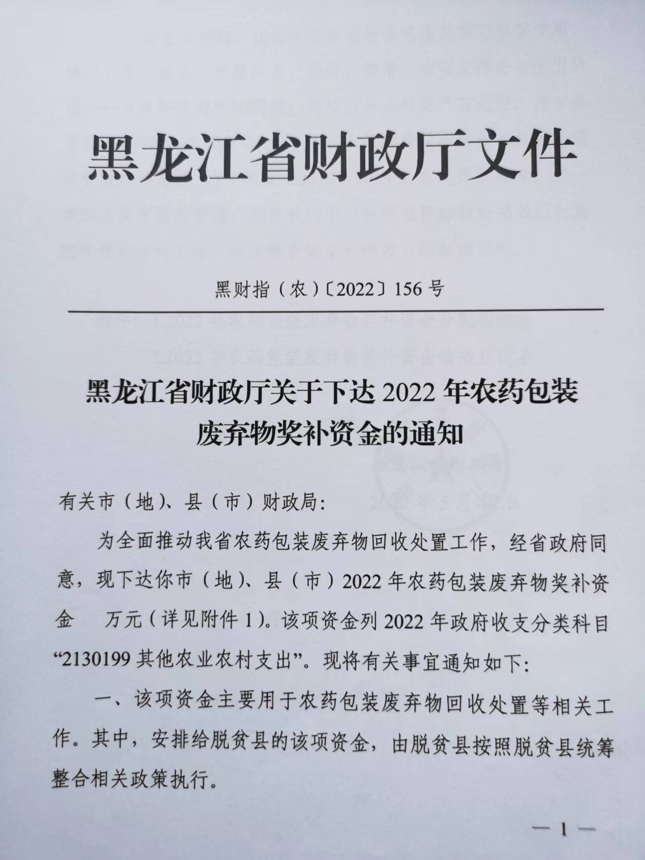 黑财指(农)【2022】156号 黑龙江省财政厅关于下达2022年农药包装废弃物奖补资金的通知