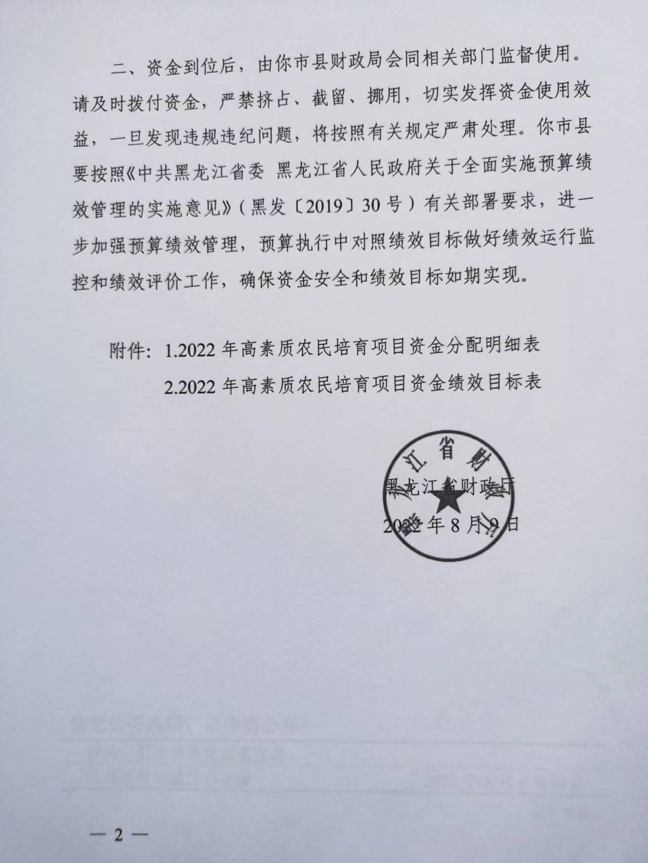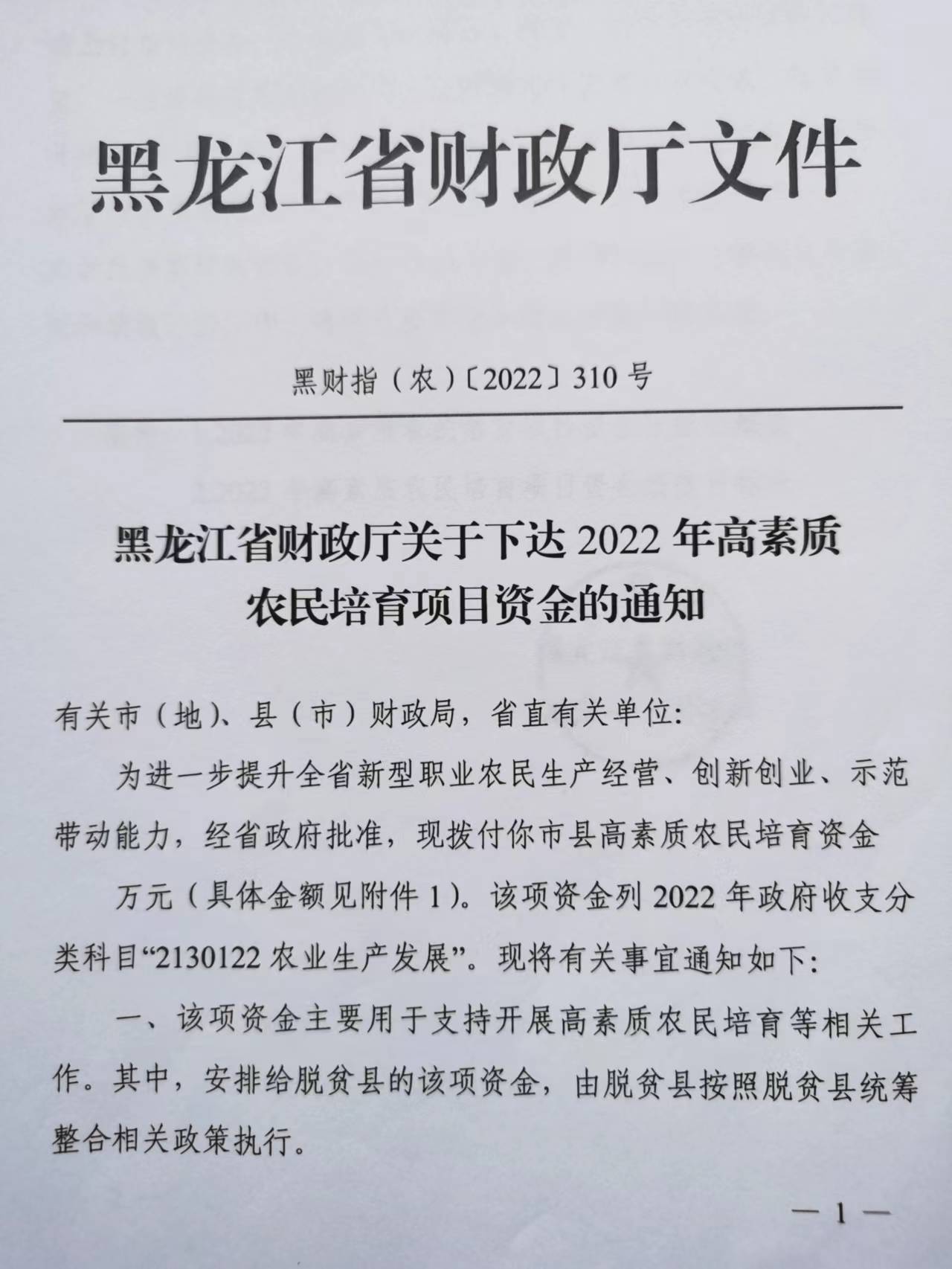 黑财指(农)【2022】310号黑龙江省财政厅关于下达2022年高素质农民培育项目资金的通知