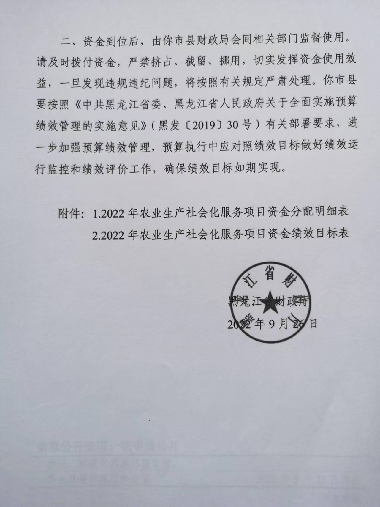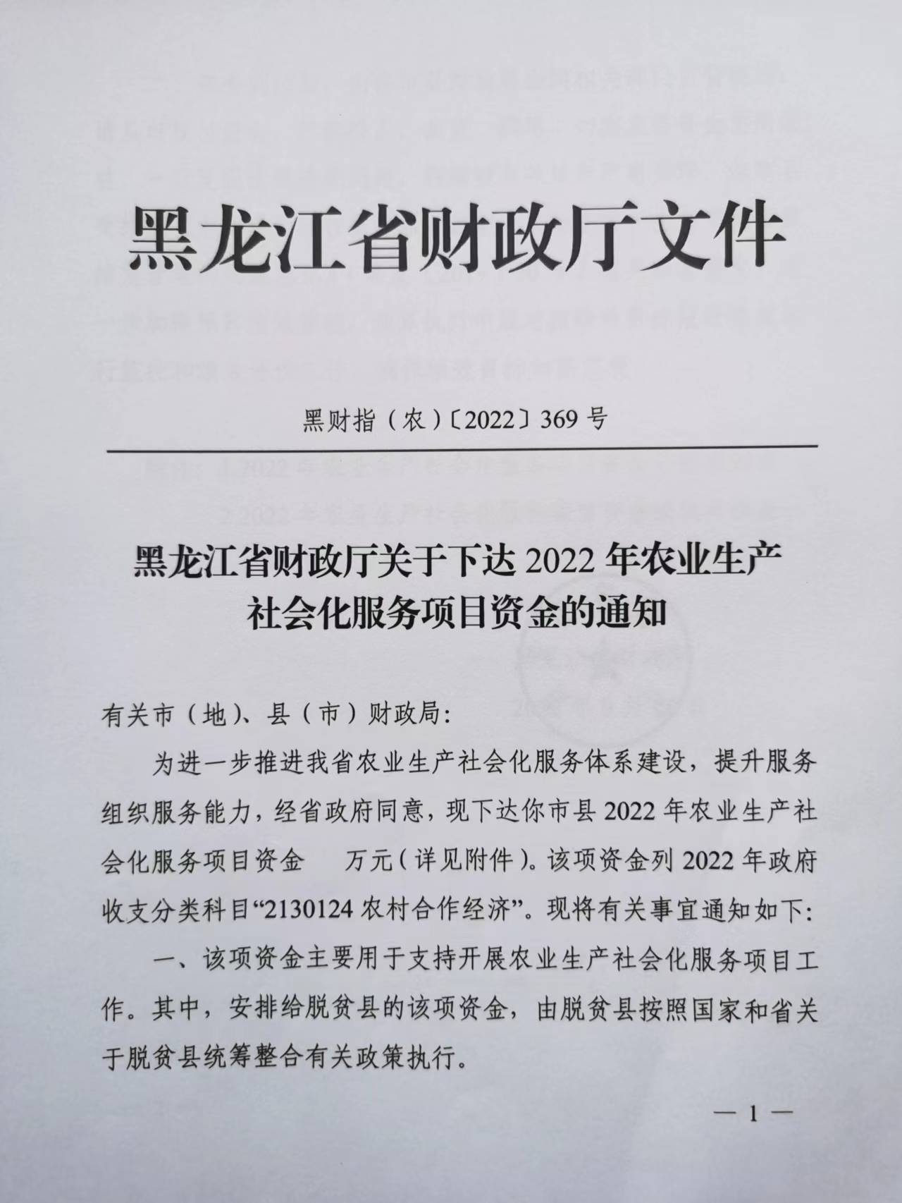 黑财指(农)【2022】369号 黑龙江省财政厅关于下达2022年农业生产社会化服务项目资金的通知
