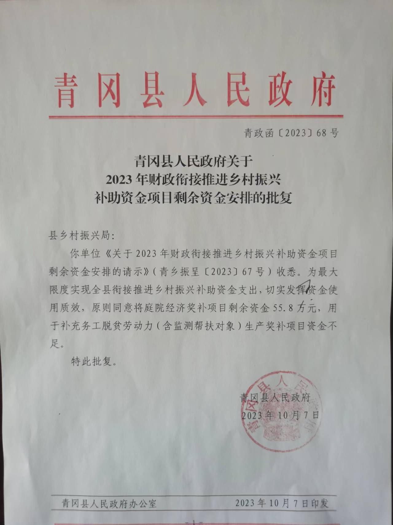 青政函【2023】68号 青冈县人民政府关于2023年财政衔接推进乡村振兴补助资金项目剩余资金安排的批复